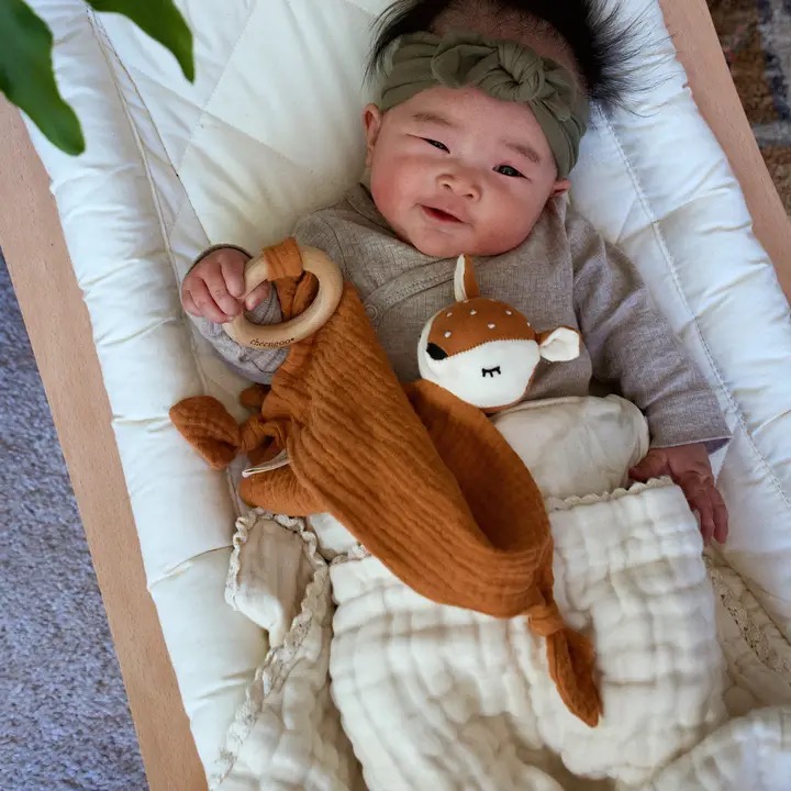 Added to your favoritesSelect options This product has multiple variants. The options may be chosen on the product page Organic Muslin Snuggle Lovey Blanket with Teething Ring | Fawn or Goose Design$26.00