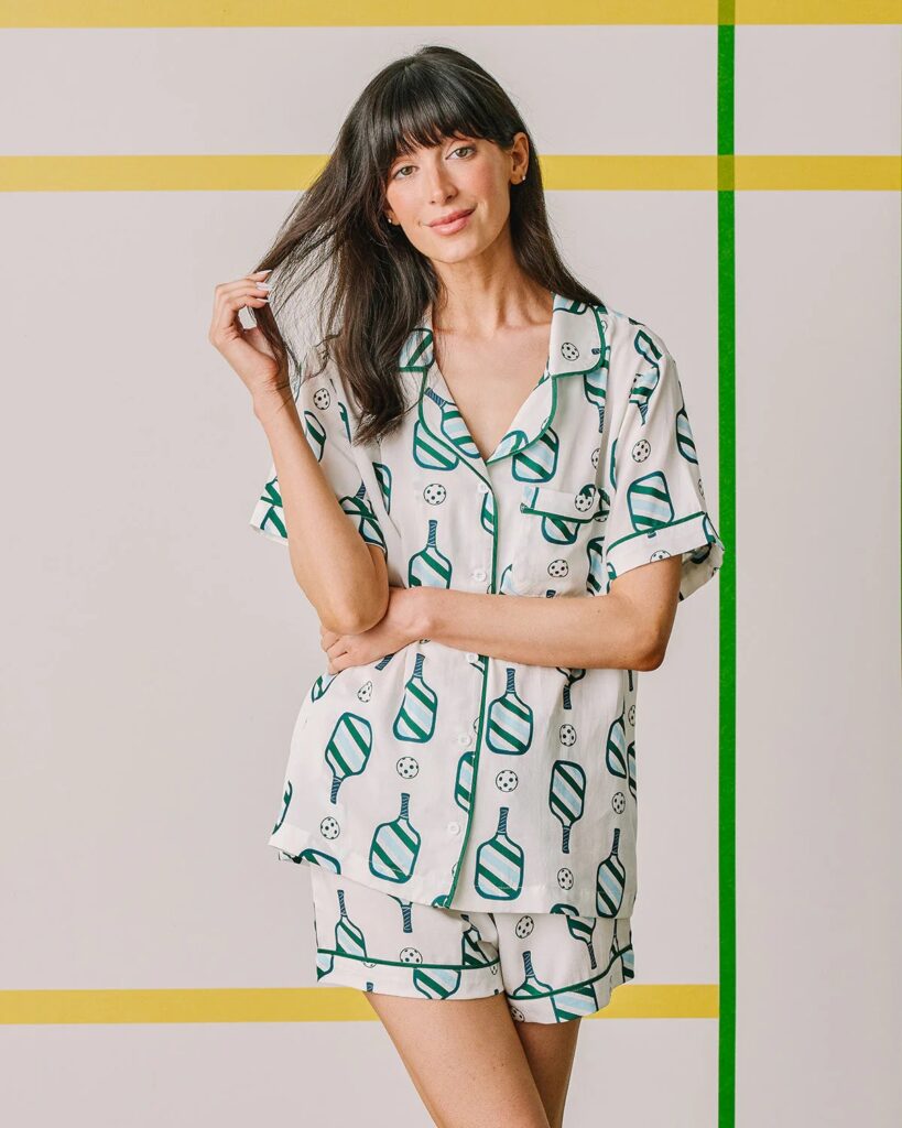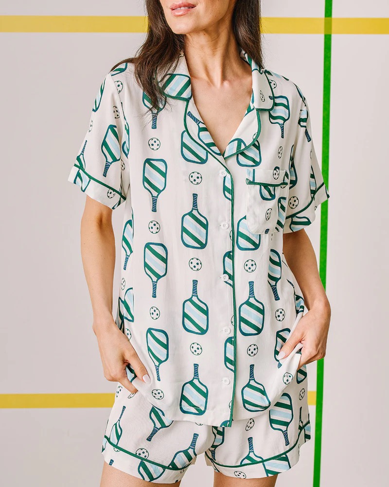 Added to your favoritesSelect options This product has multiple variants. The options may be chosen on the product page The Ace Collection – Pickleball Print Pajama Set (Shorts or Pants) by Katie Kime$118.00