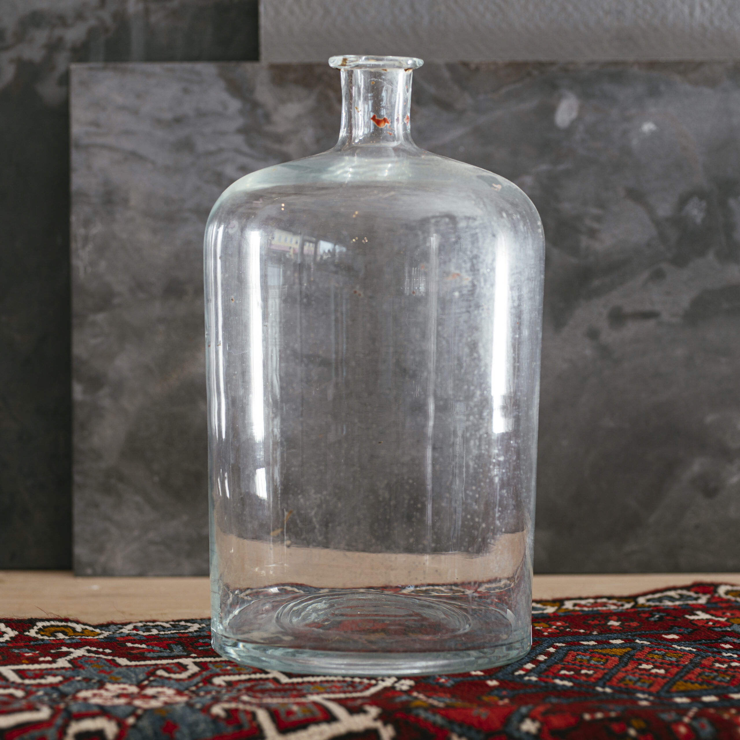 An oversized clear apothecary bottle with substantial presence and classic proportions. Its generous scale and softly reflective glass make it a striking statement piece, whether styled alone on the floor, layered into a vignette, or used as a vessel for branches or dried botanicals. A timeless object that brings quiet drama and historic character to any space.