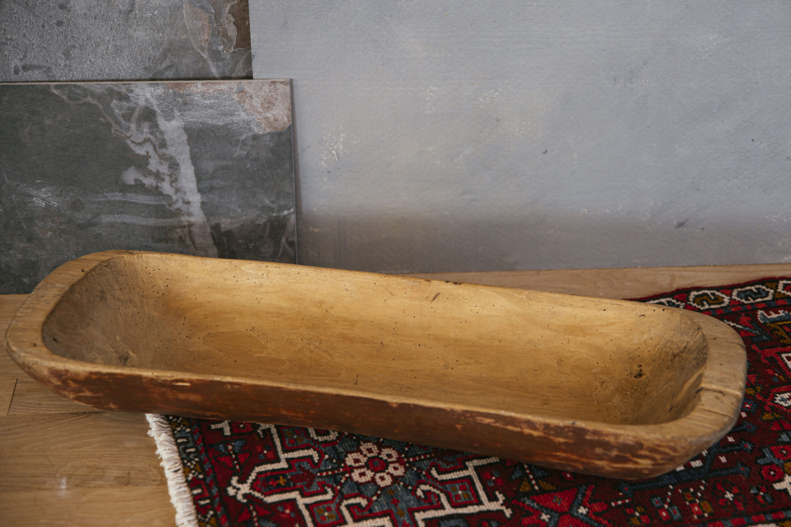 This authentic antique wooden dough bowl features a long, hand-carved form with softly sloped sides and a beautifully developed patina from decades of use. The interior shows natural wear and tonal variation, while the exterior edges retain subtle marks that speak to its history as a working kitchen vessel.