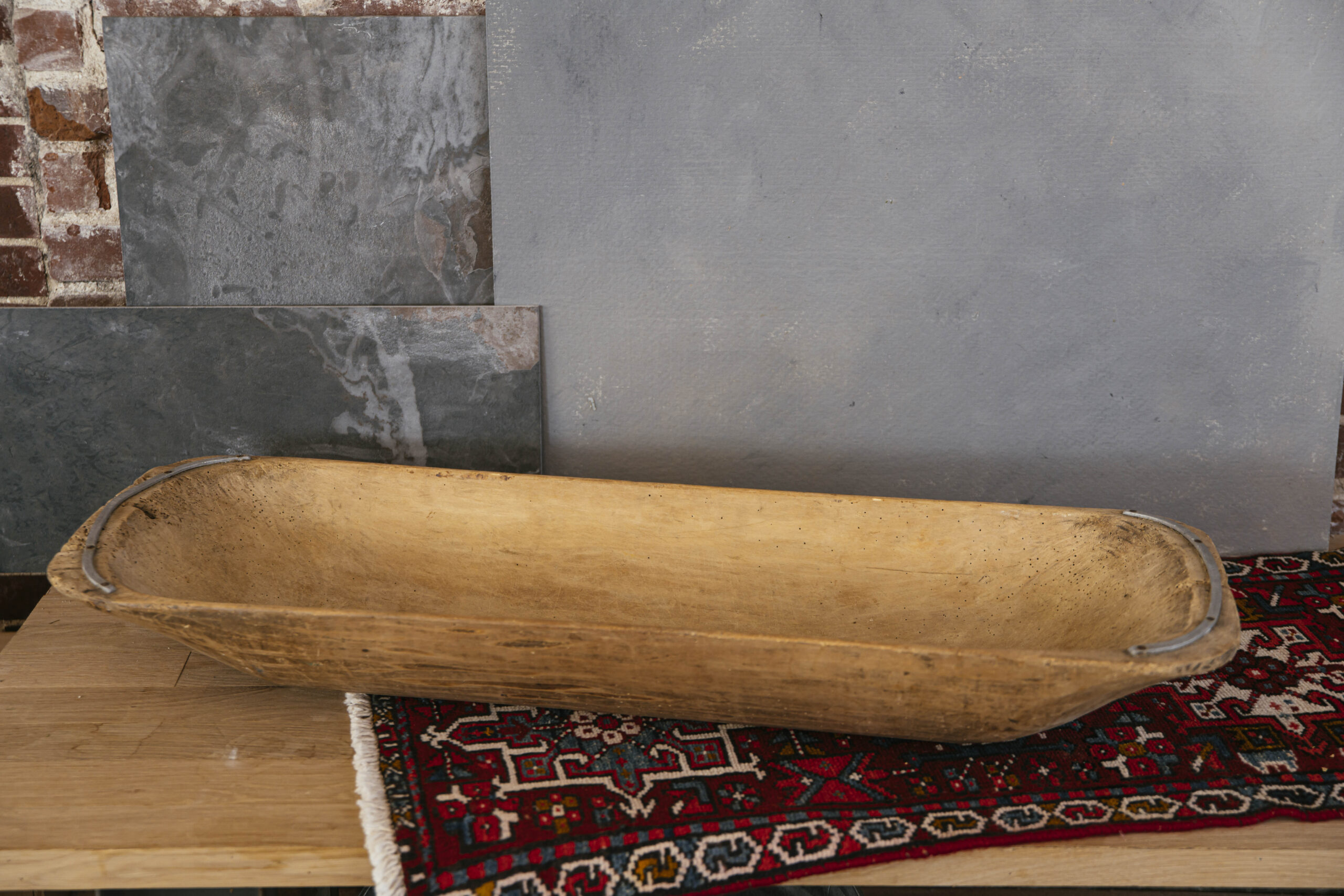 This authentic vintage wooden dough bowl features a long, hand-carved form accented with original metal edge detailing along each end. The metal reinforcement was added to protect the bowl during years of daily use, contributing to its beautifully worn patina and old-world character.